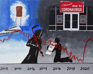 “I was inspired by the SOS Art Retrospective artworks because they all showed a variety of topics. Each artwork included multiple views and focuses on multiple pieces in the project. This inspired me to create a work that had more than one thing going on and to have it tell a story. Through this process I learned the devastation that unemployment can cause. I learned how many people and families this has affected, especially this past year. I came up with this idea because my dad was one of countless people who lost their job due to the pandemic. I connected with this topic and I had felt the impact that this issue causes. I wanted to include how destructive this issue was during 2020 so I decided to include a sort of line graph in the background created from a red wire. This showed the spike in unemployment during 2020. I also wanted to show how many people this impacted and how it could destroy lives. This is why I decided to create a grim reaper who was the stealer of jobs. Losing a job can come close to dying because it can cause people’s lives to go off the rails. I also wanted to portray how the pandemic was a huge factor of the unemployment rate spiking, so I chose to include an image of a dark storefront saying that it had closed because of the coronavirus. Finally, I wanted to include a sort of door to heaven that was labeled ‘jobs’, with a line that never ends. This was to show that so many people were out of work and getting a job is like a savior and could save them and their lives. Through this artwork I wanted to display the message that unemployment is an overlooked issue and affects millions of people. It can destroy lives to the point that it could be compared to death, and that the pandemic has made this issue even larger, hurting so many American families and people.”