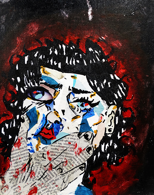 The woman in the piece is collaged randomly out of blue and white pieces of paper with one eye being made together and one being the cut out of a real eye. I did this to symbolize a Chinese traditional kintsugi which are blue and white plates who symbolize beauty and when they crack they crack into gold showing that it only gets even more beautiful. I wanted the woman to be made out of this with the gold cracks to show even the more and more she broke from the abuse she was still beautiful in a positive light and she wasn’t a bad person because of it. Her face like the eye isn’t proportioned right and it isn’t pretty for a reason. Someone who’s being abused isn’t pretty and it shouldn’t be romantic as many people do romanticize it in movies. The hand is made of newspaper with the blood on its hands to show that the abuser isn’t the only one abusing the weekend but also the news and media who really normalizes abuse and doesn’t bring it up in the right fashion which can affect the person’s mind on what had happened to them.