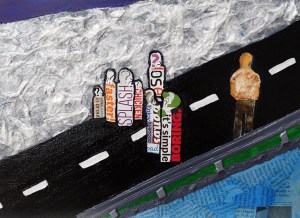 In my piece I used newspaper clippings to create the water and magazine clippings to make the people in the back pressuring the kid on the cliff to jump. The people are created with words to show what they are saying but also to show people are full of hurtful words.