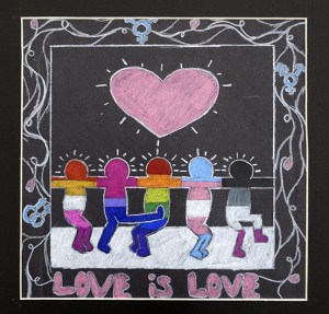 PROJECT: Having learned about the graffiti style artwork of Keith Haring and guided by art teacher Melissa Ambs, Steve Groh, Katie Jacobs, or Jamie Schorsch, students created a drawing in the style inspired by Keith Haring as a means of using symbolic imagery to communicate a message based on a global or social issue.
