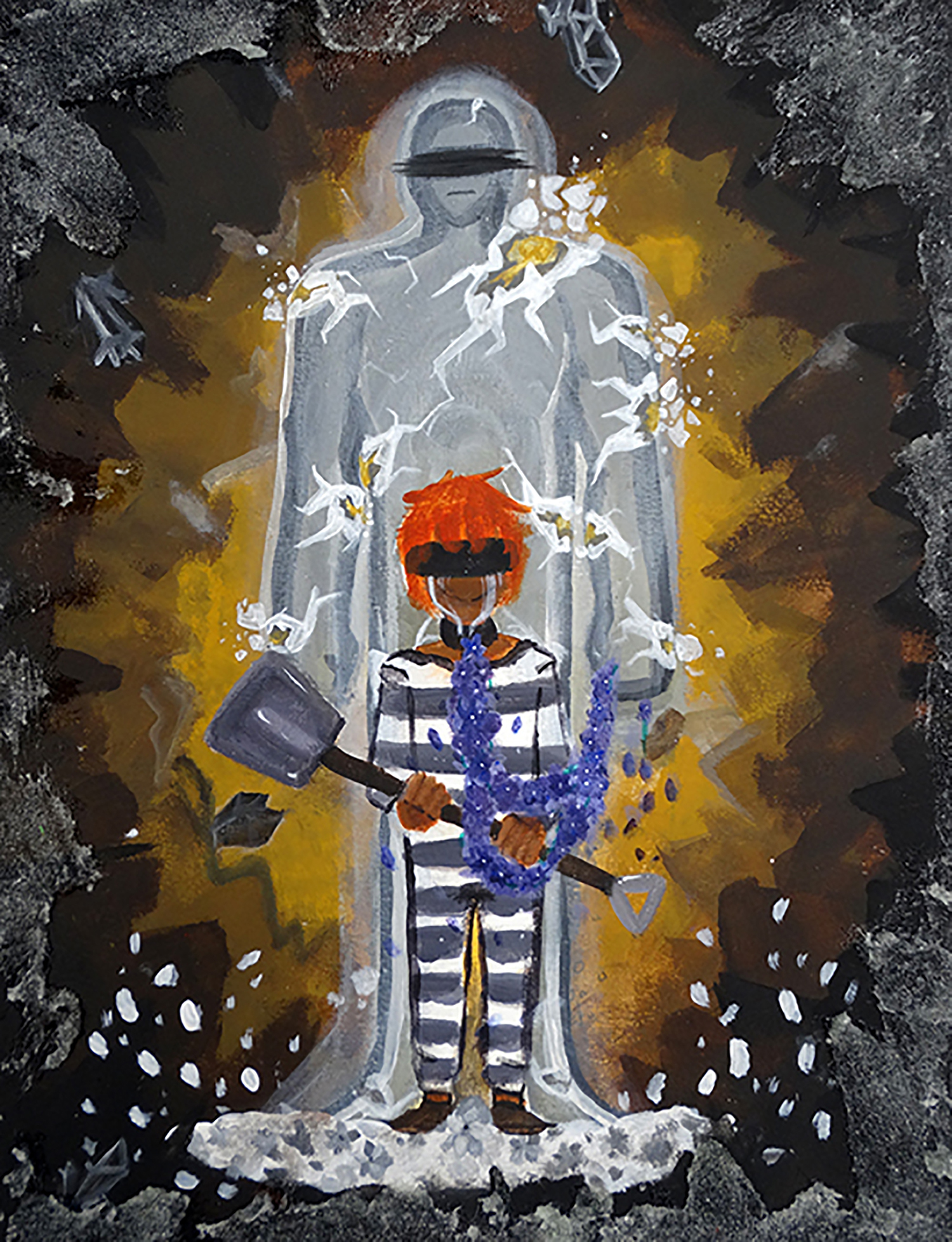 “My piece is about Article 5 of Human Rights, Freedom from Torture and Degrading Treatment. In my mind, this includes children’s labor rights, especially concerning the diamond mines, the physical consequences and the emotional cost of such painstaking work and lack of proper help and resources. This kind of abuse and exploitation against helpless children isn’t something that only happens overseas. My painting depicts two characters, one a broken gray “shadow” figure and a blindfolded child with a shovel inside a cave with gems scattered around. The figure is holding a vine with the flower spring crocus which is also known as the penitent rose. It’s connecting to a collar on the crying child with the gladiolus flower crushed underneath their feet, all to represent the emotional toll this kind of treatment has on a child.The exploitation of children has decreased only in recent times and only in extreme cases as international laws have been put into place to stop the worst-case scenarios. The less extreme cases are often overlooked. We need to protect those who are experiencing abuse and other types of exploitation and help those who have experienced this in the past, to heal from their scars, visible or not.”