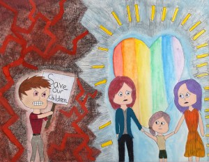 ‘My art piece relates to article 16 of Human Rights, Right to Marriage and Family and focuses on LGBT families and adoption. It represents a scene of an LGBT family being discriminated against by someone who doesn’t agree with LGBT people adopting. I wanted to capture both sides of the situation and show how different their ideas and opinions were but also how it was affecting LGBT families who were just trying to have a family. I have friends who have LGBT families and some who are in fact a part of the LGBT community themselves and they are being discriminated against.”