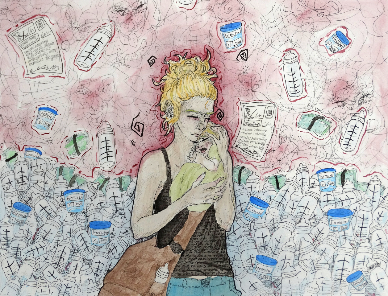“My piece is about Article 2 of Human Rights: the right to human life, and the controversy on breastfeeding in public. People should be able to feed their children without others shaming, judging or sexualizing them. Between mammary infections and mastitis, and constant pumping, breastfeeding within itself isn’t easy and it shouldn’t be made worse when you’re shamed and sexualized for it. I wanted to try and express the physical and emotional frustrations that many people face with this topic and perhaps to show people it’s not a bad thing, quite the opposite. It’s extremely natural, it’s how all mammals feed their young, and have fed their young for millennia.”