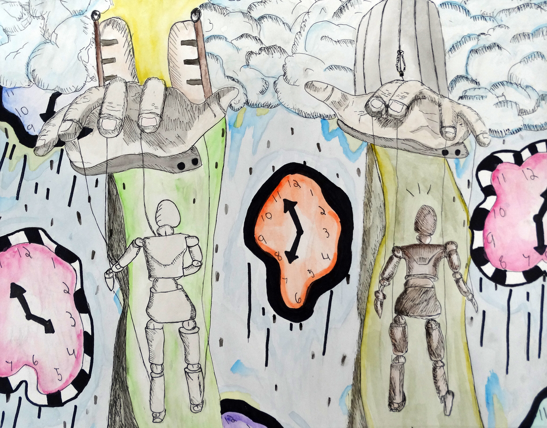 “My art piece relates to article 2 of Human Rights and addresses systemic racism in America. I used two mannequins controlled by hands to signify the destiny of people, one Caucasian and one of color. The road of the Caucasian mannequin is on brighter green grass and follows the road into open gates with a bright yellow sun. On the contrary the mannequin of Color is on a murky green road leading to closed prison gates as 1 in 4 African Americans are locked up in their lifetime.