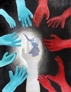 “My art piece focuses on sexual assault awareness, the effect on victims, and how no one is alone in their fight. It relates to article 5 of Human Rights, freedom from torture and degrading treatment, and shows red and teal hands reaching out around a silver hand supporting a monochromatic woman. The assaulters’ hands are red to symbolize an angry and pernicious attitude towards the woman.The color teal for the helping hands is the color of the sexual assault awareness ribbon. Sadly, the first national assault awareness month campaign wasn’t until 2001.”