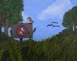 “’Humans Hurt’ shows a way that we have tried to stop people from invading an ecosystem and harming it any further. Some places have important types of moss and organisms that live on the ground. These organisms keep the ecosystem together and help share what the individual plants need. When someone walks or runs over these organisms it can harm them which can, in turn, harm the entire ecosystem because these organisms keep them alive. People place signs around these places to keep others out but even sometimes those are not enough. My painting wants to show the importance of keeping the environment clean and safe.”