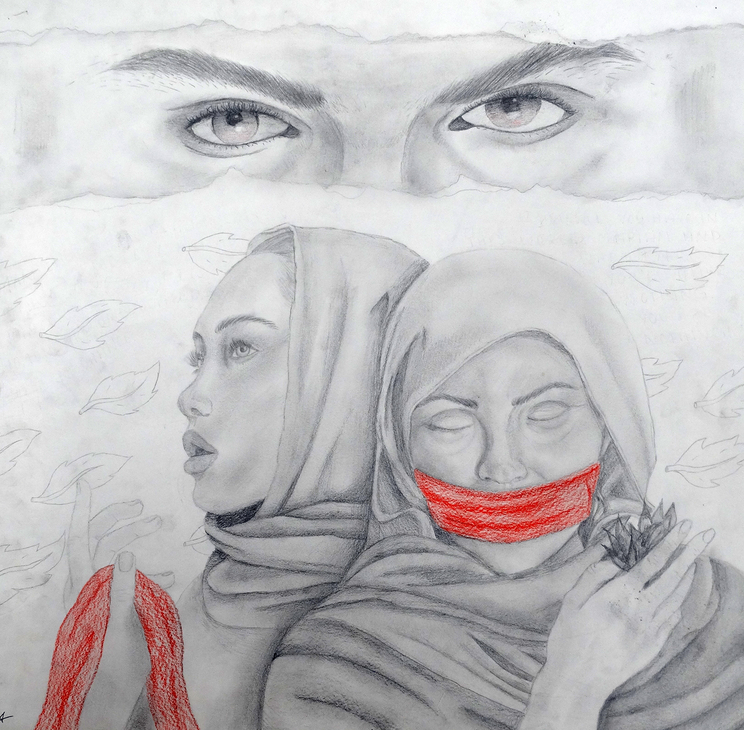 “Women around the world are constantly struggling for a voice of their own. The novel, “A Thousand Splendid Suns” by Khaled Hosseini, takes place during the Taliban’s control over Afghanistan. It follows the lives of two Afghan women, Miriam and Leila, who grew up with vastly different lives but ended up in the same place. Throughout the book Miriam refers to two “twin poisonous flowers”, love and hope. These “twin flowers” can also be seen in the protagonists themselves, Leila representing hope for a better future, and Miriam representing love through her willingness to sacrifice everything for the people she cared about. In my piece I depict the two protagonists of the novel, with red scarves to represent the oppression they experienced during the reign of the Taliban. Leila, pictured on the left, is removing her scarf and opening herself up to “the winds of change” and a new life, while Miriam, pictured on the right, is unable to remove her scarf and remains closed off to the future in exchange for the safety of the ones she loved. In her hand are the poisonous flowers which represent hope and love.”