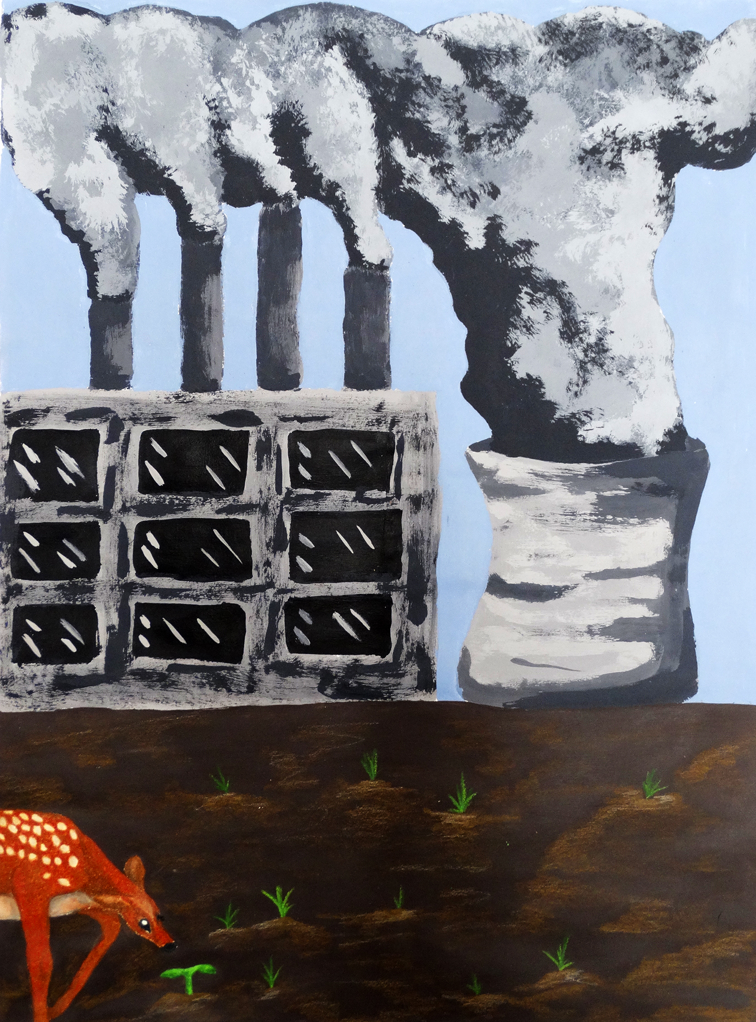 “When you look around at the animals, do you ever wonder what they go through? People have made plastic, factories, scrap metal, and other dangerous things for the animals or nature in general. My piece shows how big a factory is and how much it can damage an animal’s life. The pollution coming out of the factory looks like clouds but filled with harmful materials. The small patches of grass around the factory shows how it is killing everything around it. My piece shows the danger of man-made pollution.”